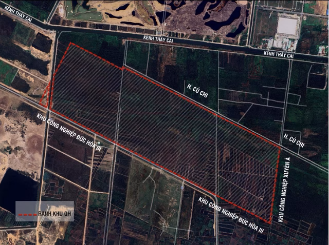 Dự án nằm ở phía Đông giáp kênh T2 và khu công nghiệp Xuyên Á, phía Tây giáp đất trống, phía Nam giáp đường tỉnh 823B và phía Bắc giáp kênh ranh. Địa hình chủ yếu là đất chưa sử dụng, 88% diện tích là đất tràm hoang, thuận lợi cho việc chuyển đổi mục đích sử dụng.