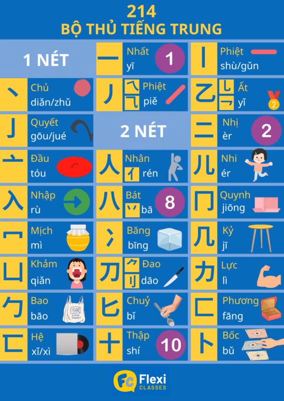 - Nội dung: Đầy đủ 214 bộ thủ chữ Hán cơ bản, có phần Pinyin.