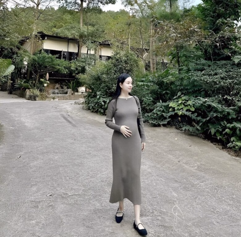 Trong các bức ảnh mới, cô chọn những chiếc váy body co giãn, ôm trọn vòng bụng đang lớn dần. Dù bụng bầu “vượt mặt”, tay chân vẫn thon gọn, làn da sáng mịn và nụ cười luôn tươi tắn.