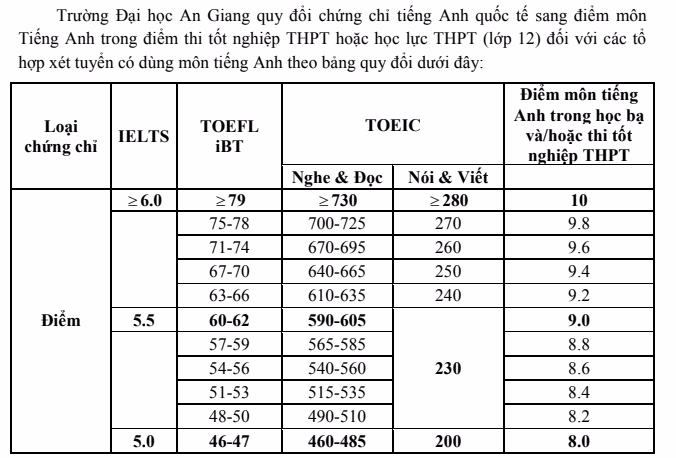 Phó Giáo sư, Tiến sĩ Nguyễn Văn Mện, Phó Trưởng phòng phụ trách Phòng Đào tạo của Trường Đại học An Giang (Đại học Quốc gia Thành phố Hồ Chí Minh), thông tin rằng nhà trường có 3 phương thức xét tuyển, trong đó, phương thức 1 (tuyển thẳng) với 4 đối tượng có dựa trên kết quả các chứng chỉ ngoại ngữ quốc tế kết hợp với kết quả học tập trung học phổ thông. Tuy nhiên, do vị trí địa lý nằm ở khu vực Đồng bằng sông Cửu Long, nên khó thu hút được thí sinh có chứng chỉ ngoại ngữ quốc tế. Vì vậy, hằng năm, nhà trường chỉ tuyển được rất ít thí sinh có chứng chỉ tiếng Anh, các em đăng ký vào một số ngành học chuyên về tiếng Anh.